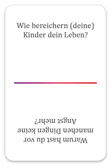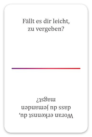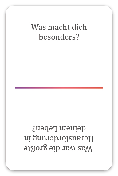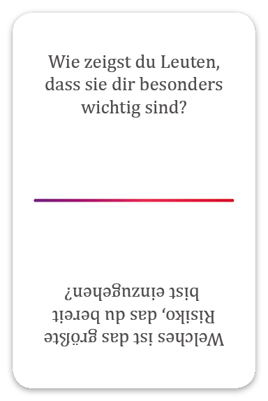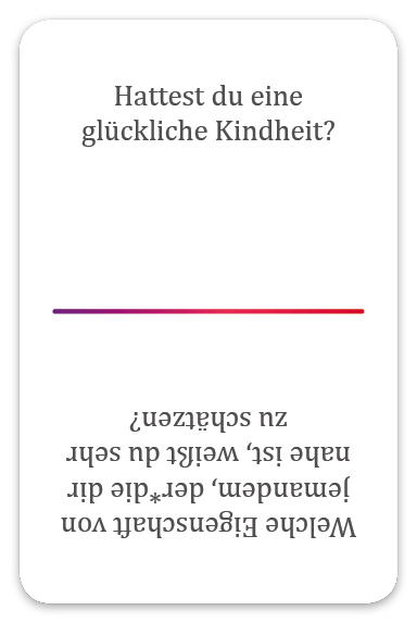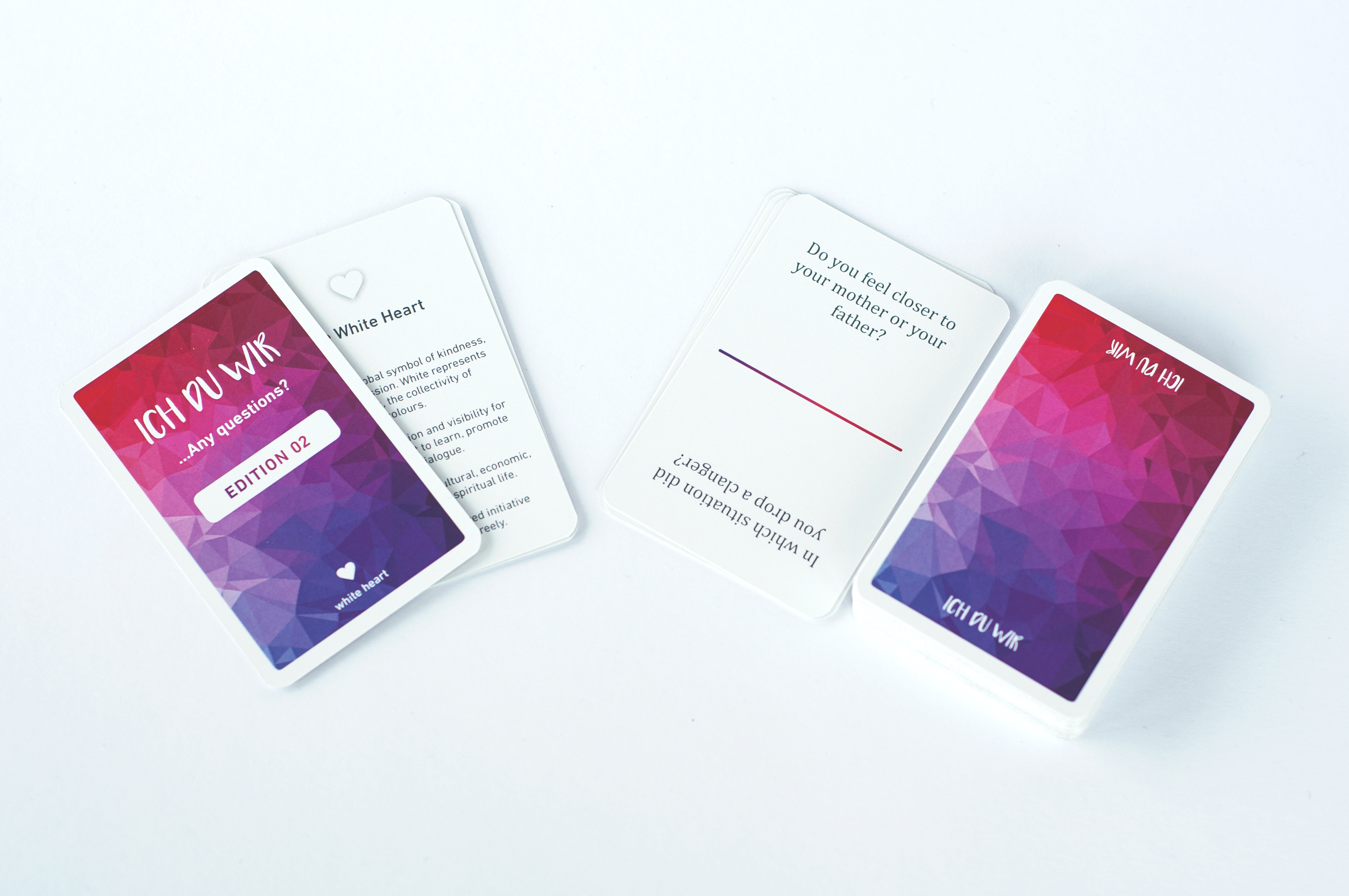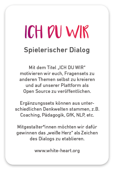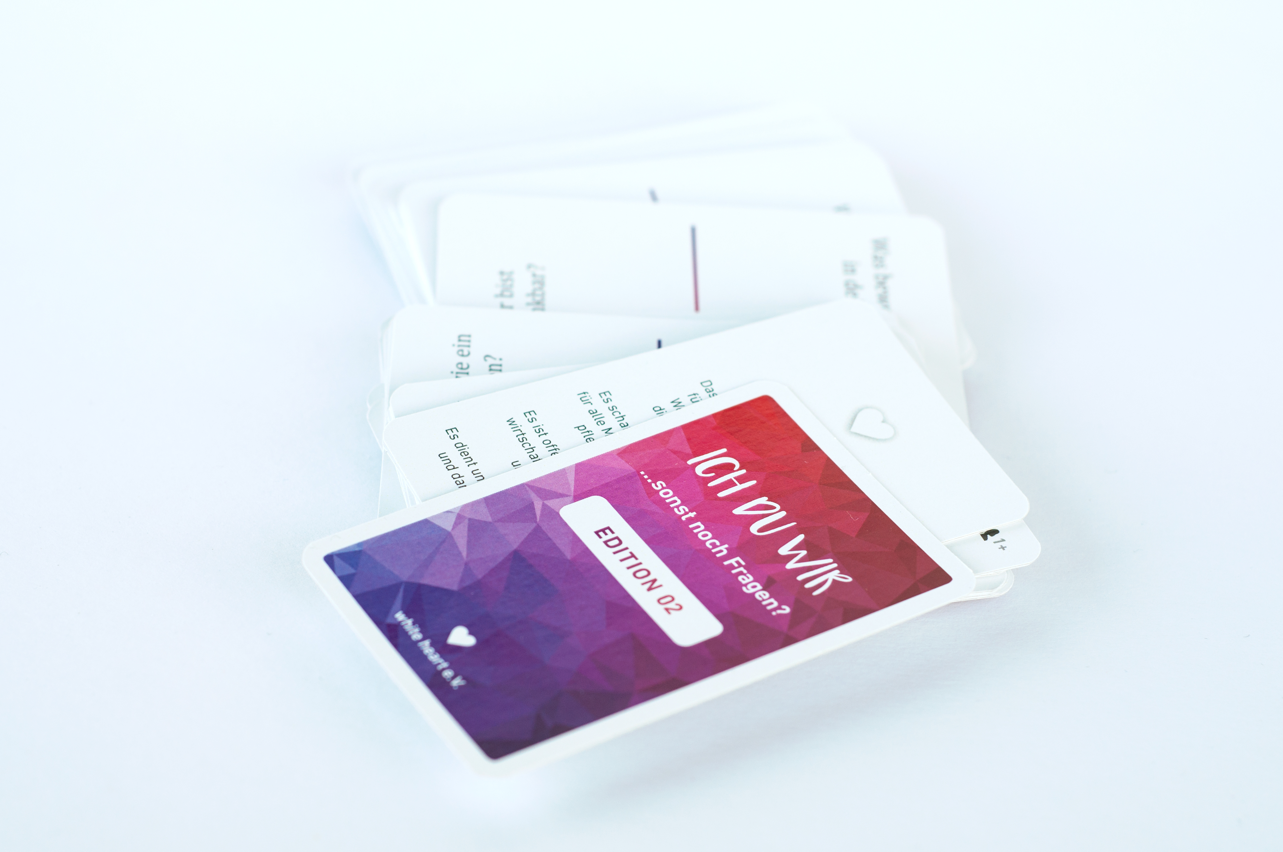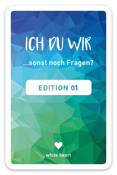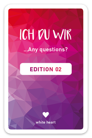 Mit dem Fragenset ICH DU WIR bieten wir euch die Möglichkeit, spielerisch in einen Dialog einzusteigen. Die Fragen sollen euch beim (besser) Kennenlernen helfen und eurem Gespräch mehr Tiefe ermöglichen. Dabei kannst du dich auch selbst besser kennenlernen.
