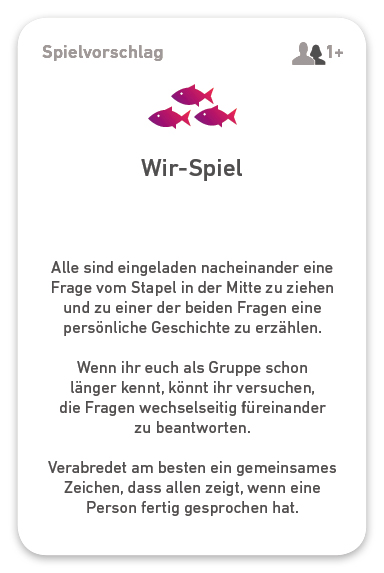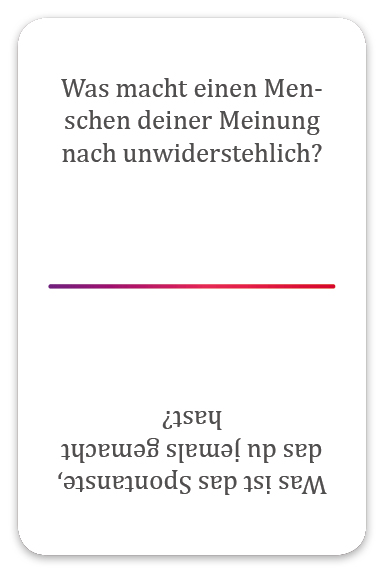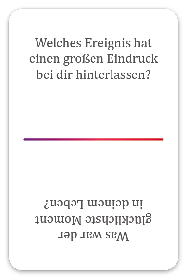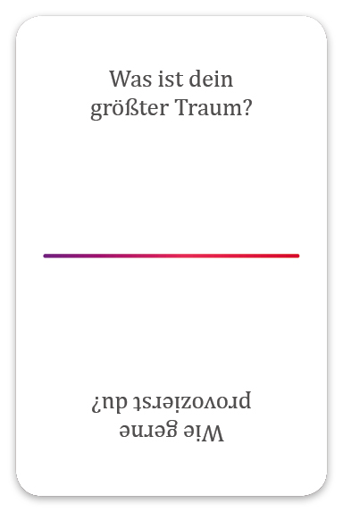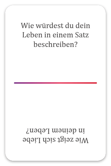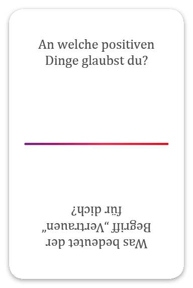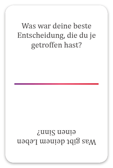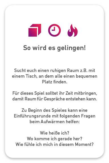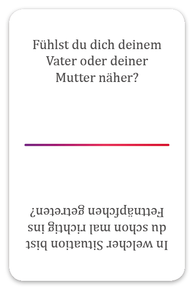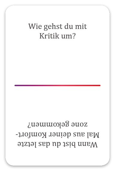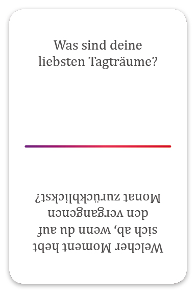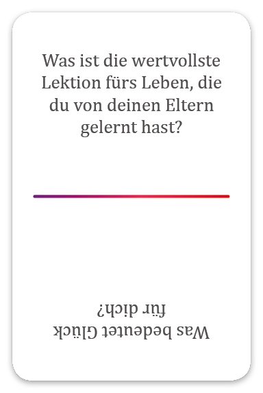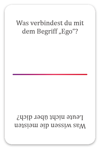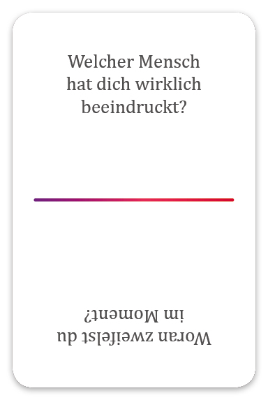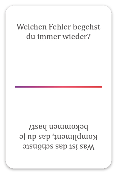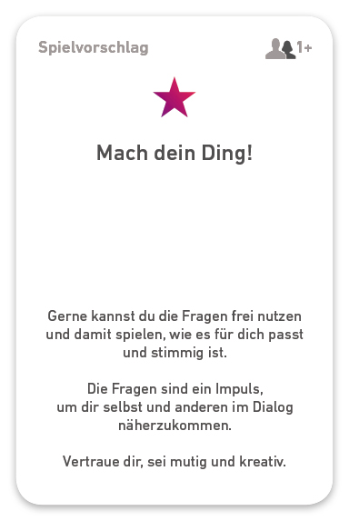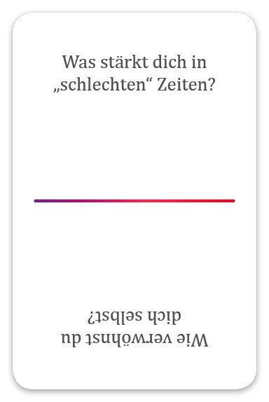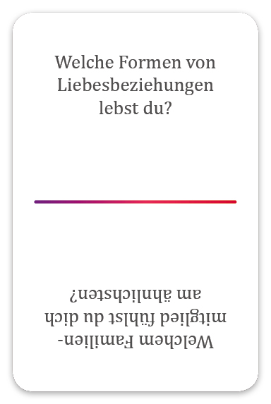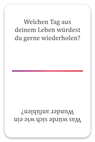 Mit dem Fragenset ICH DU WIR bieten wir euch die Möglichkeit, spielerisch in einen Dialog einzusteigen. Die Fragen sollen euch beim (besser) Kennenlernen helfen und eurem Gespräch mehr Tiefe ermöglichen. Dabei kannst du dich auch selbst besser kennenlernen.