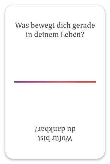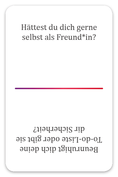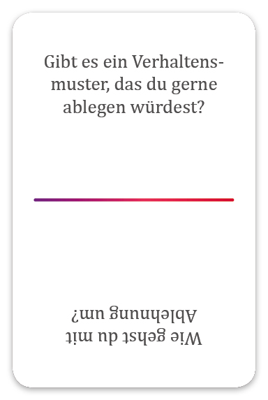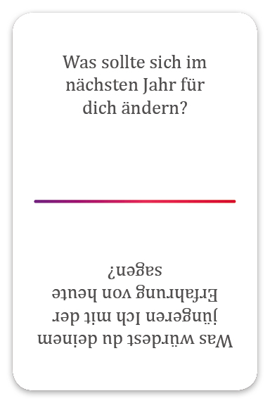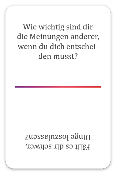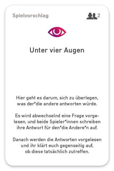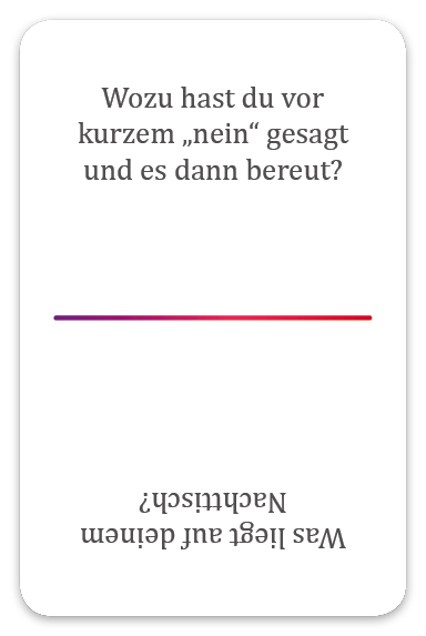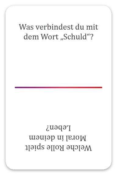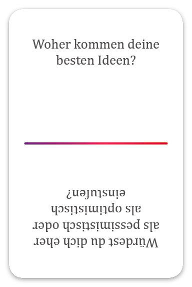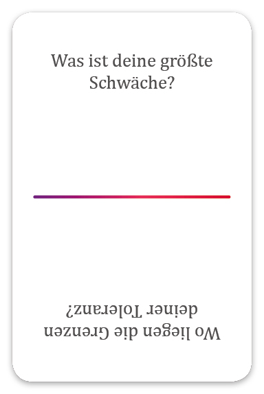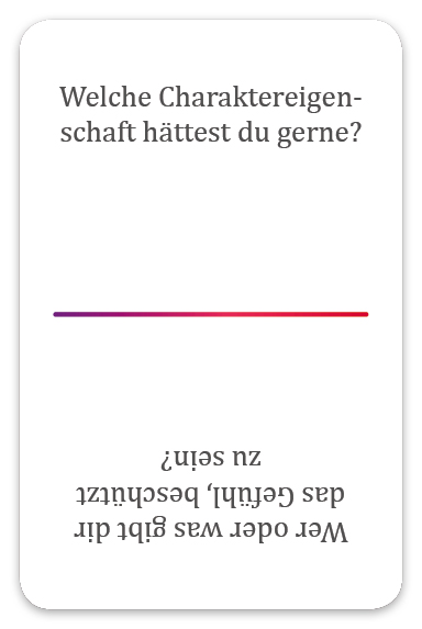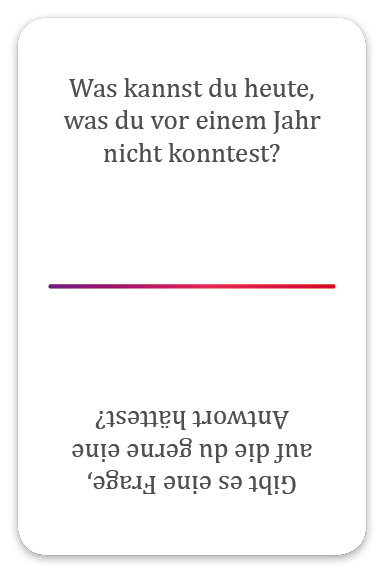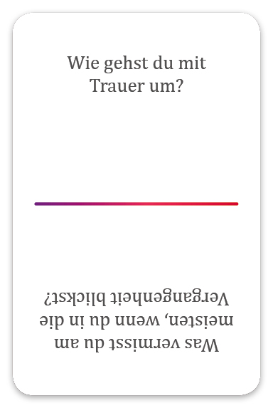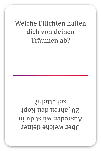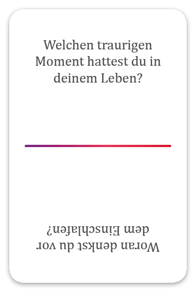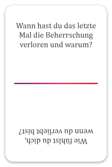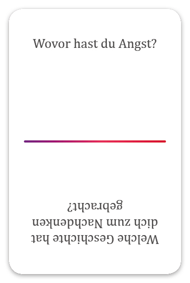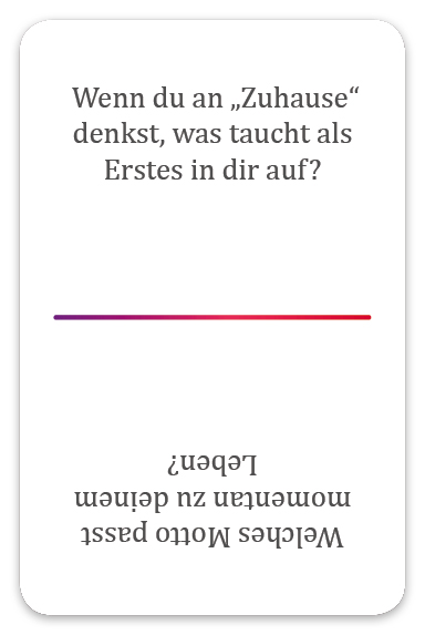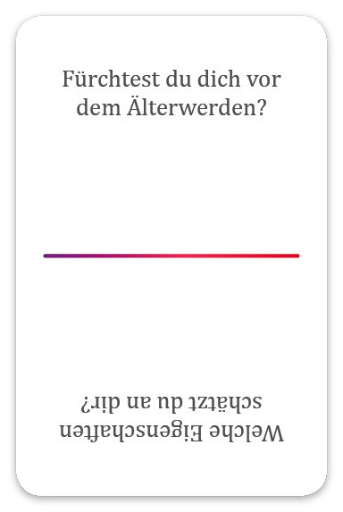 Mit dem Fragenset ICH DU WIR bieten wir euch die Möglichkeit, spielerisch in einen Dialog einzusteigen. Die Fragen sollen euch beim (besser) Kennenlernen helfen und eurem Gespräch mehr Tiefe ermöglichen. Dabei kannst du dich auch selbst besser kennenlernen.